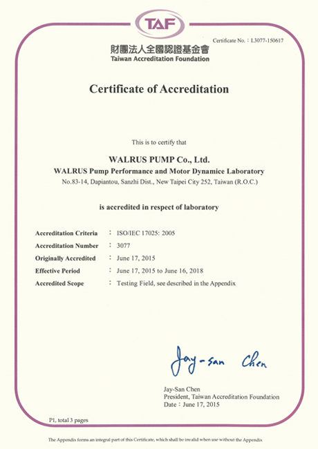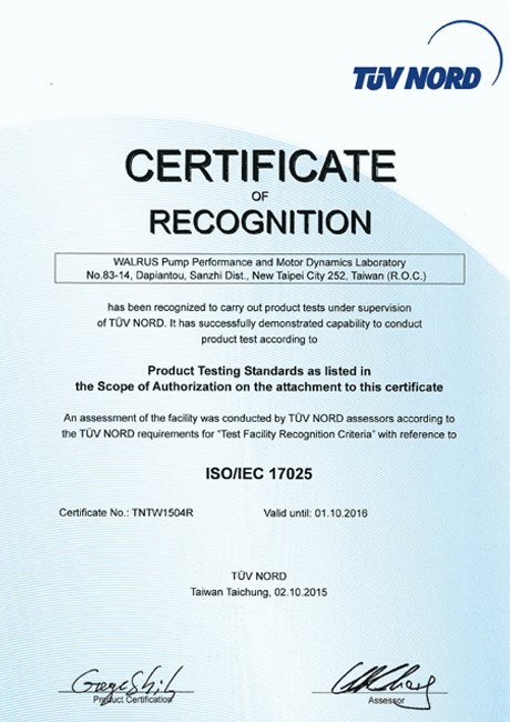 水泵動力實(shí)驗(yàn)室獲得國內(nèi)外泵浦最新能效認(rèn)證(ISO9906、CNS16017)。