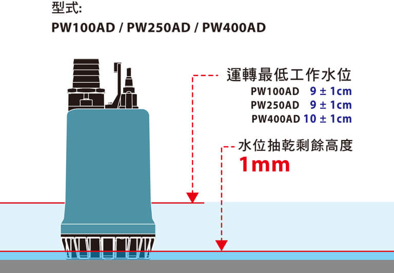 PW400A最低工作水位:10 ±1 cm